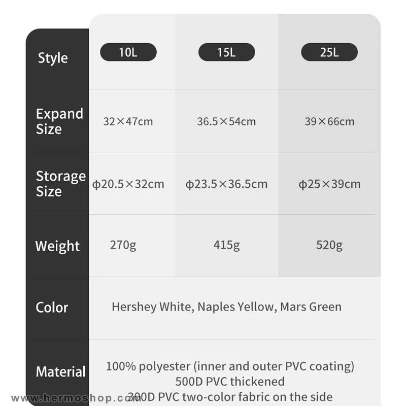 در ضمن دارای ظرفیتی برابر با 25 لیتر است. این محصول با وزن کم 520 گرمی که دارد که حمل و نقل آن برای طبیعت گردان راحت تر شده است همچنین ابعاد داری بگ درحالت باز شده 39×66 سانتی متر و در حالت جمع شده 25×39 سانتی متر می باشد.